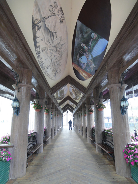 步行街最尾端的茵特拉根廊橋可以看見整個茵特拉根酒店和旁邊的湖