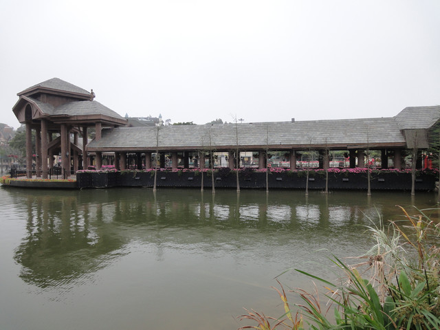 從廊橋側面觀看,廊橋倒影於湖面上,盡管天氣不佳,景色一樣很美