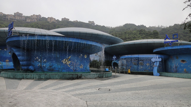 "深海探奇"外觀是數棟連在一起的藍色圓形水泥建築物,上頭繪滿海洋生物圖案