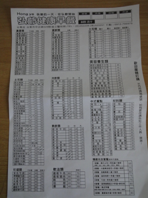 2012-03-31,旅館並未提供早餐,但提供合作商家"弘爺健康早餐"電話,我們訂購鮪魚蛋漢堡35元+香烤里肌加蛋土司40元+熱米漿15元,早餐吃得豐盛美味又便宜