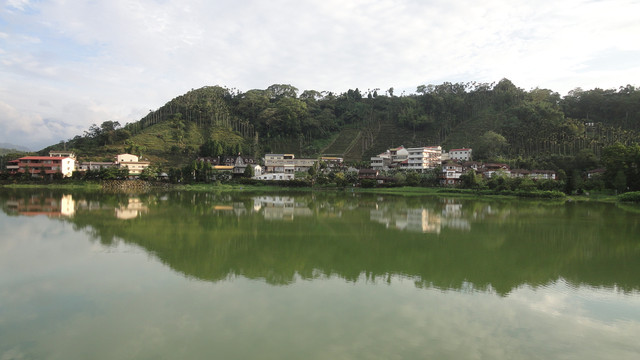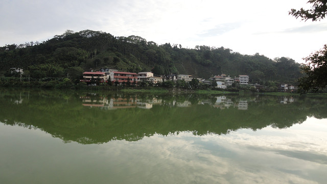 正對面的房舍清晰地到映在湖水中,平靜無波的湖面宛如一面大鏡子,令人驚嘆