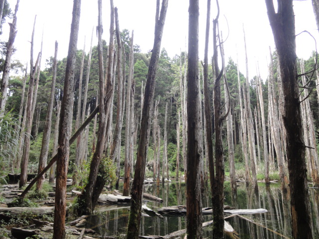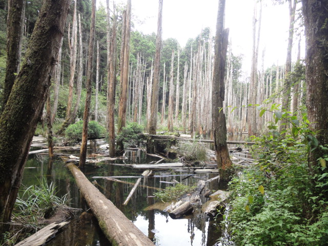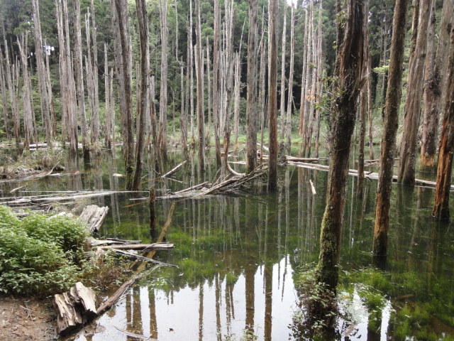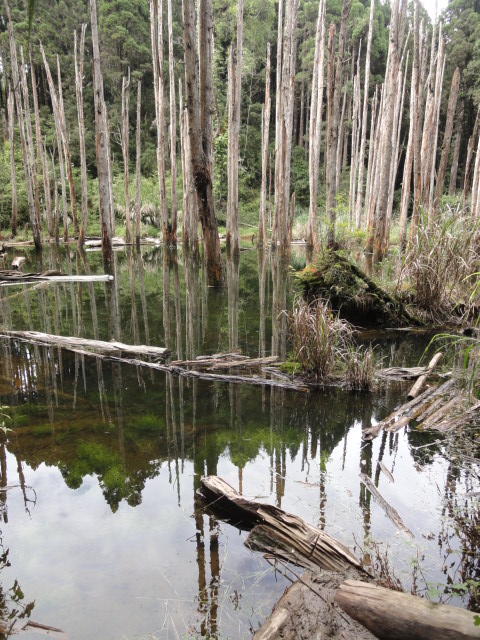 來到忘憂森林一眼望去是筆直黝黑的杉木佇立,或傾倒在沼澤中,平靜的水面反射出杉木與天空的倒影,美的叫人說不出話來