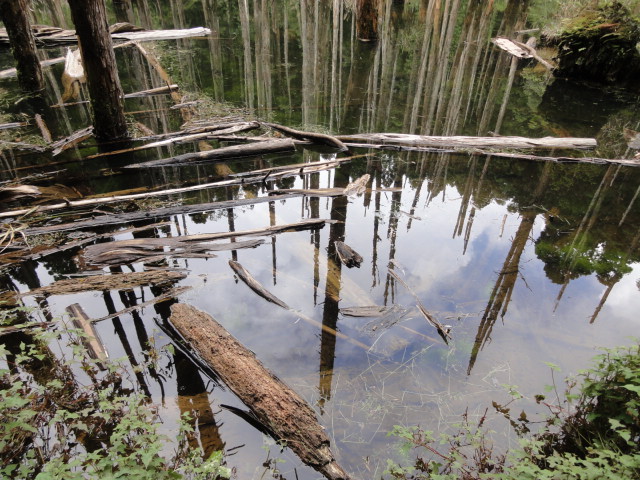 清澈的沼澤將腐糗的杉木倒映在水面上,清晰可見