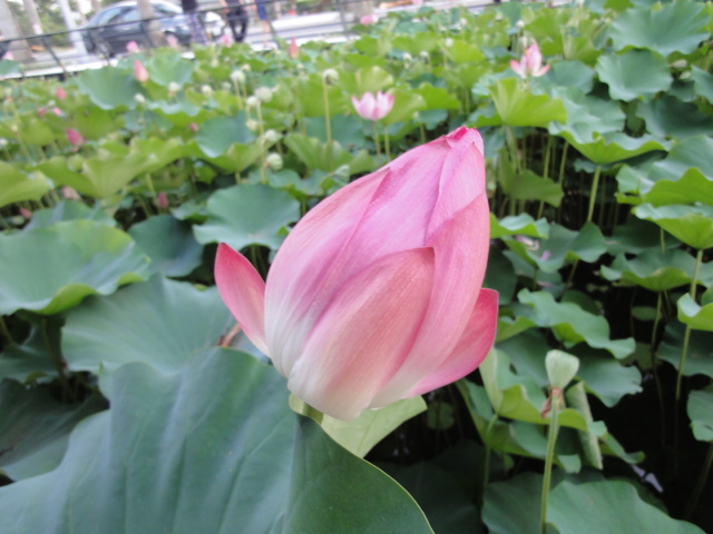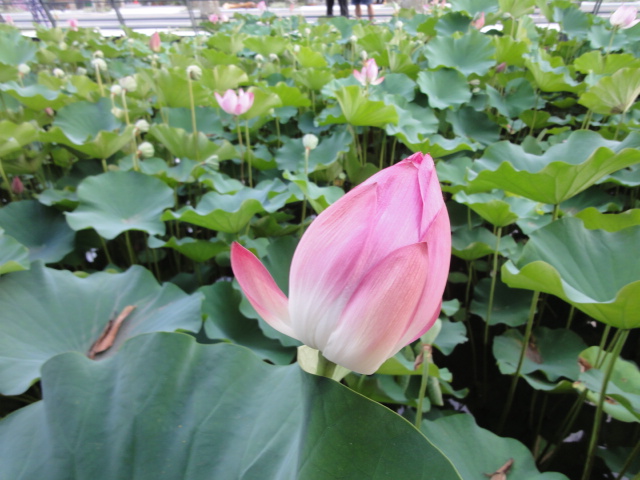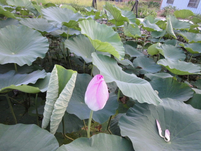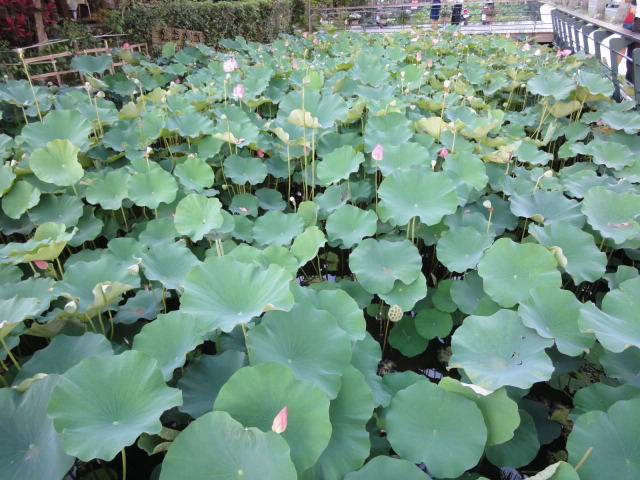 今年每個荷花池栽種時間不一,所以有的池已經盛開,有的仍是含苞待放,也有的池還是綠油油一片